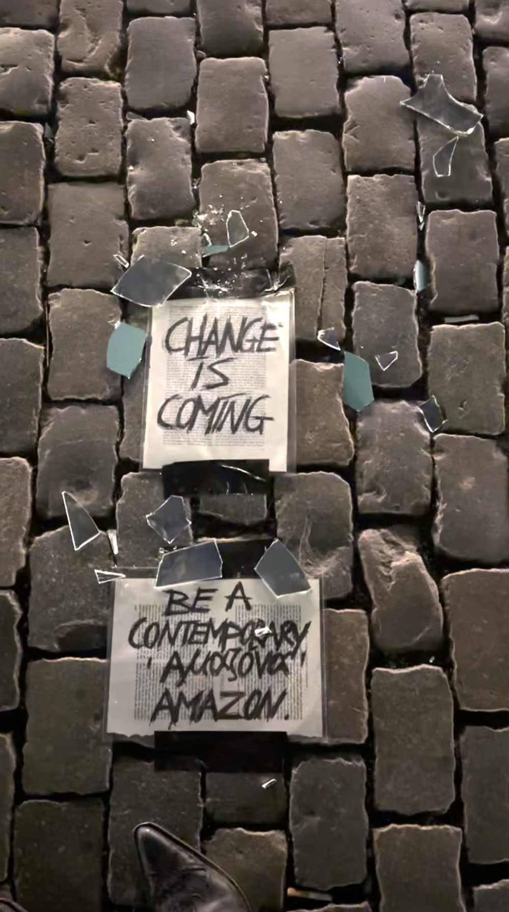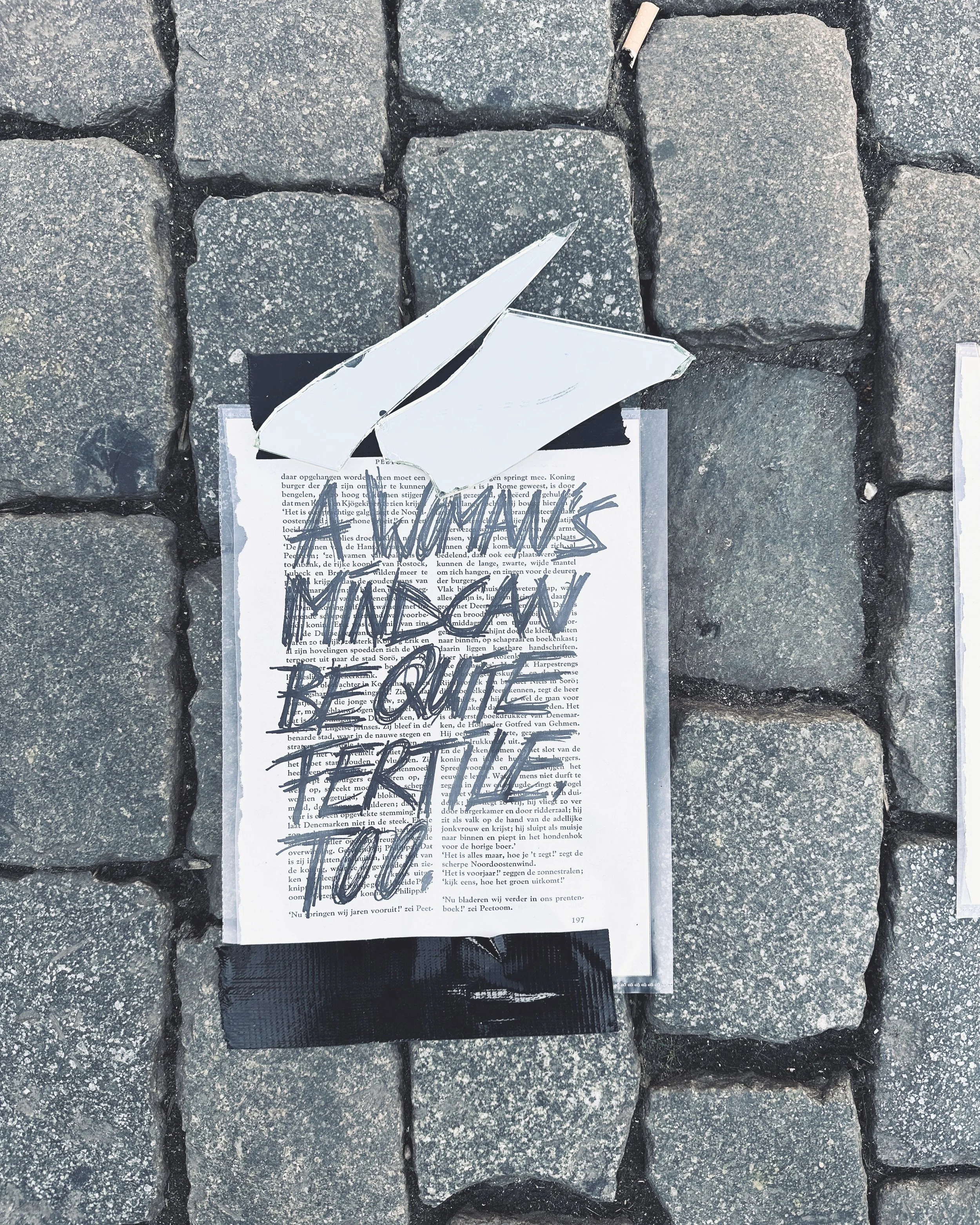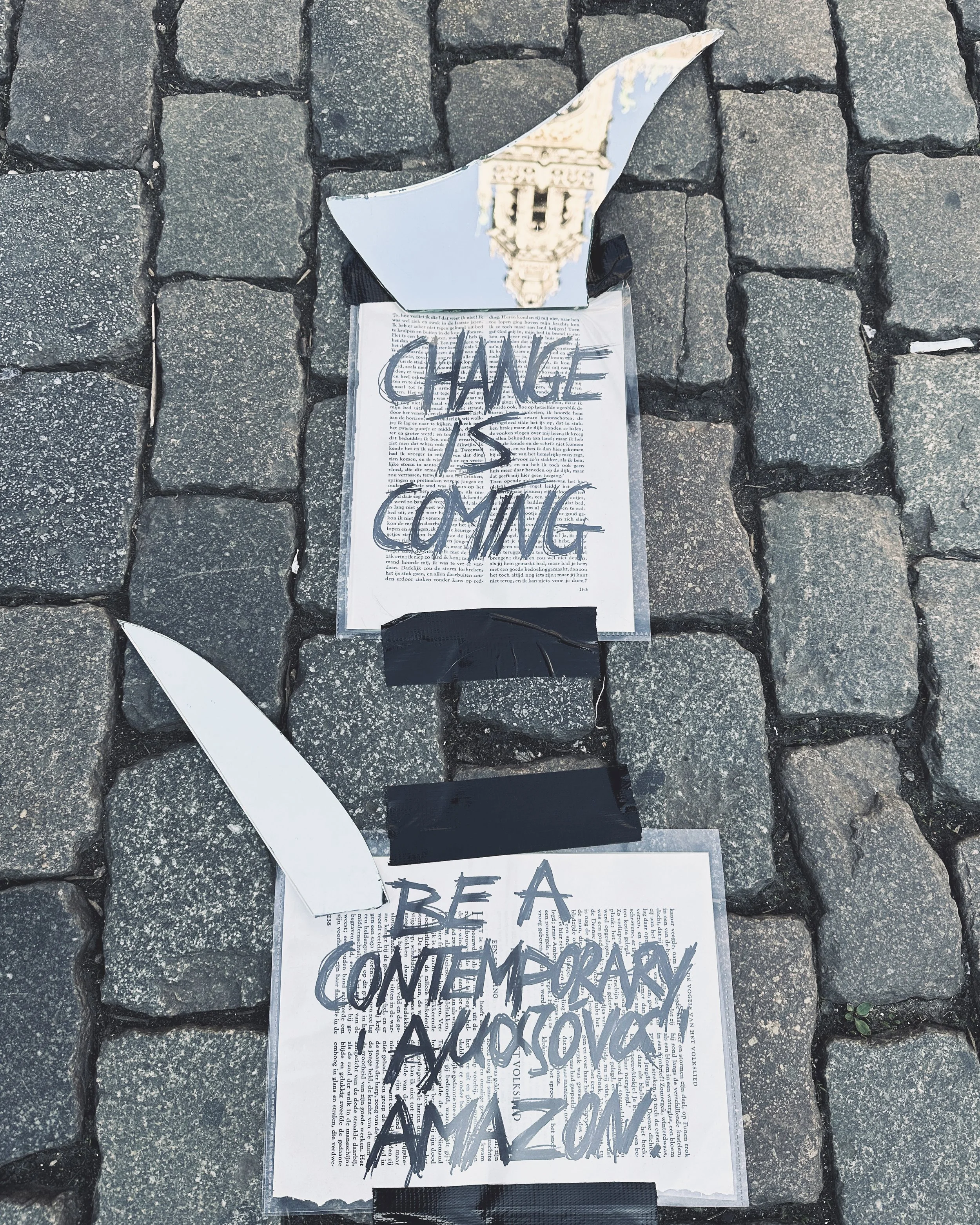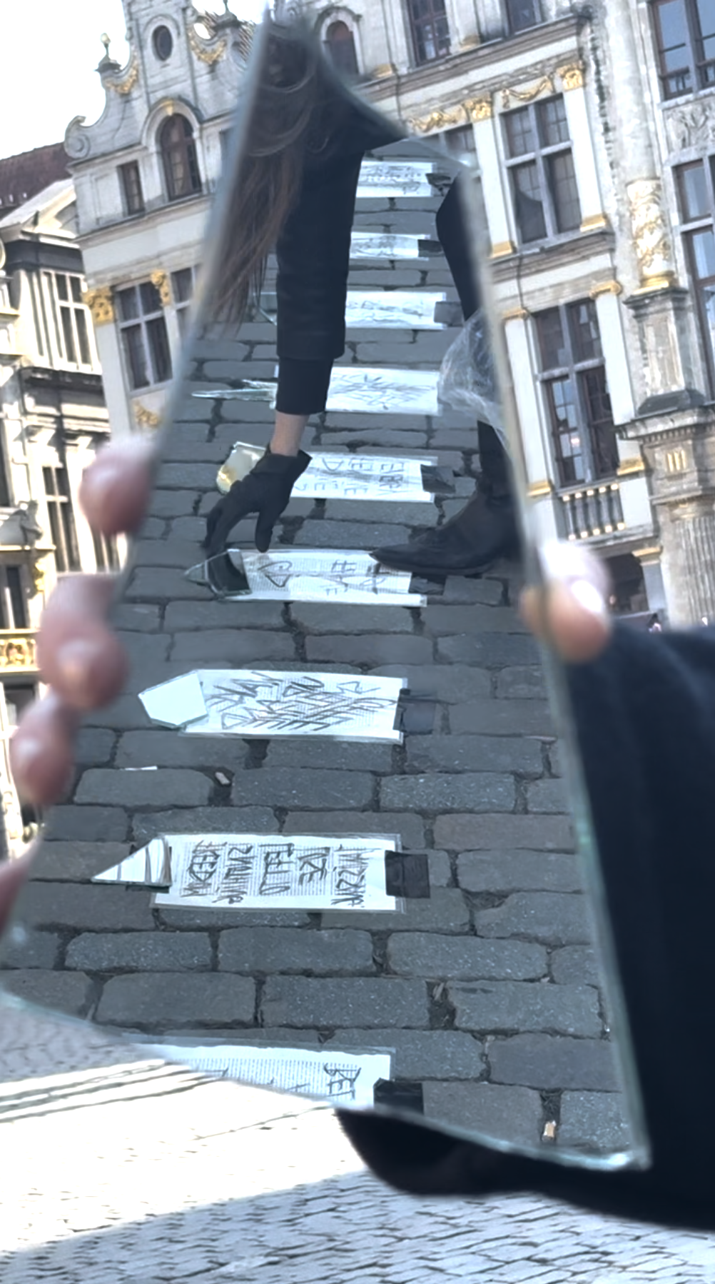 In total twenty-one feministic - targeting Andrew Tate, yet forgiving - statements were placed on the floor in the center of the square, positioned as a battle line, symbolising the ancient Greek Amazons. Each textual statement was accompanied by a mirror shard, sharp as a contemporary weapon. Both the texts and the shards were left behind, not knowing if, and by whom, the works were eventually taken and cherished, or destroyed and discarded.