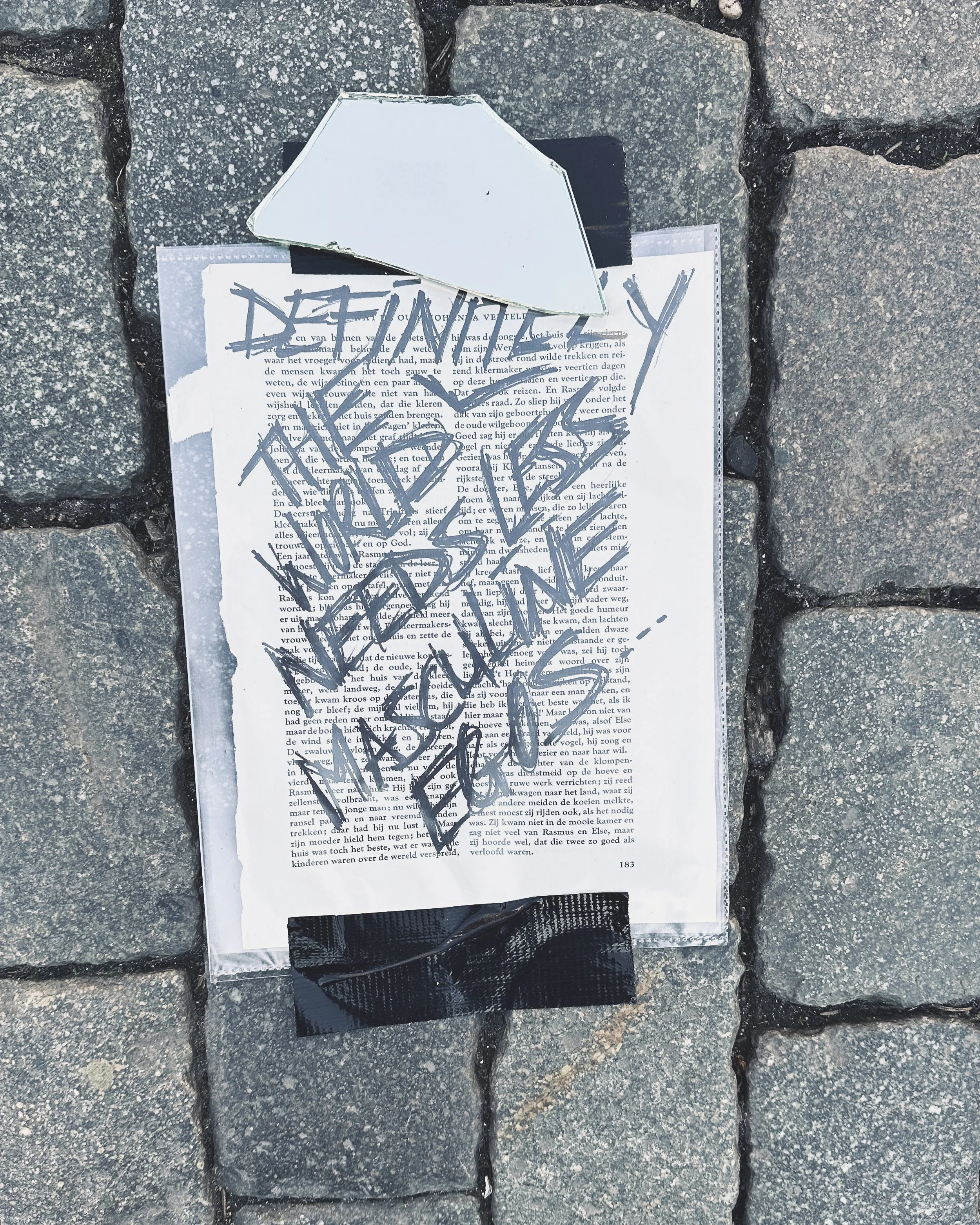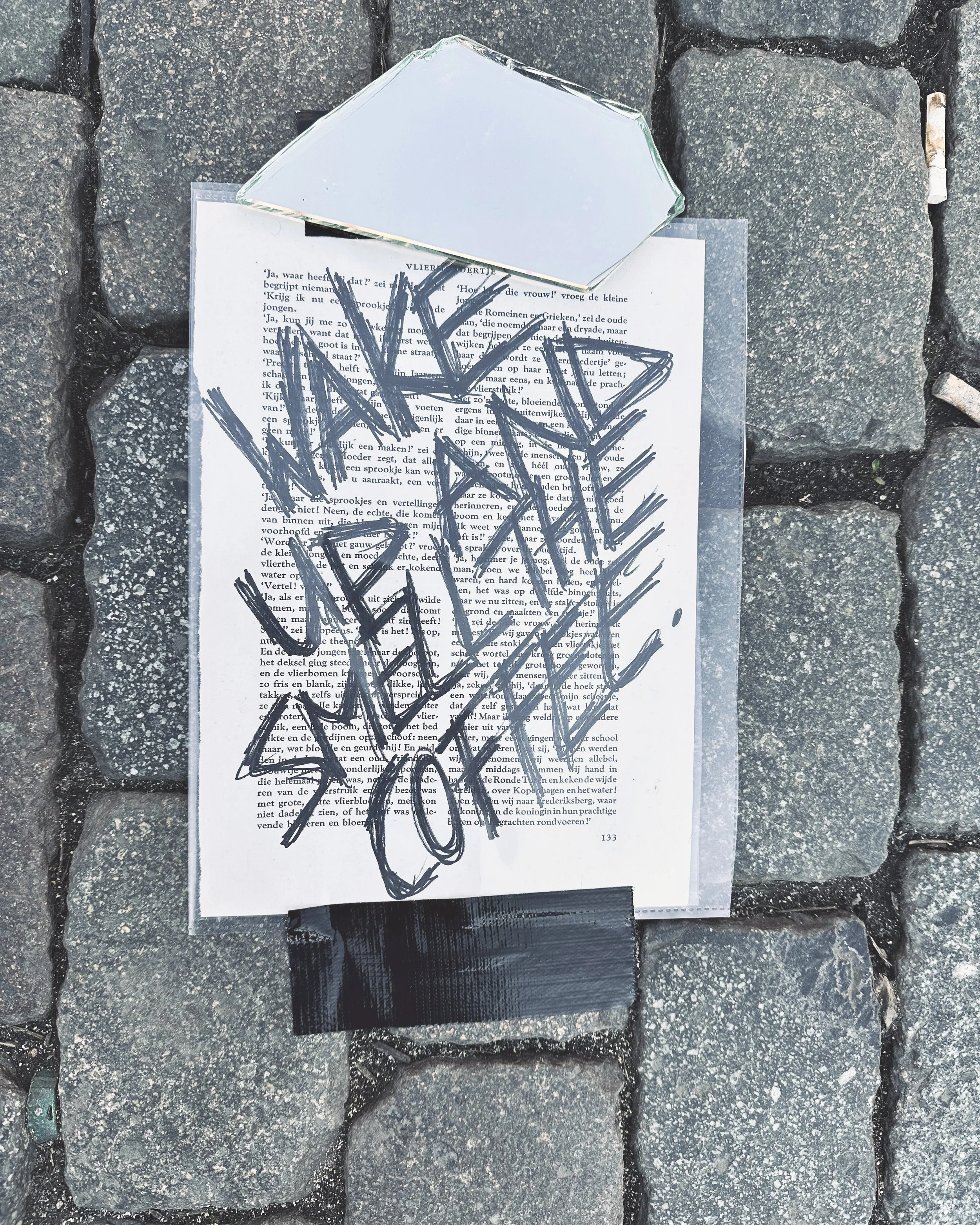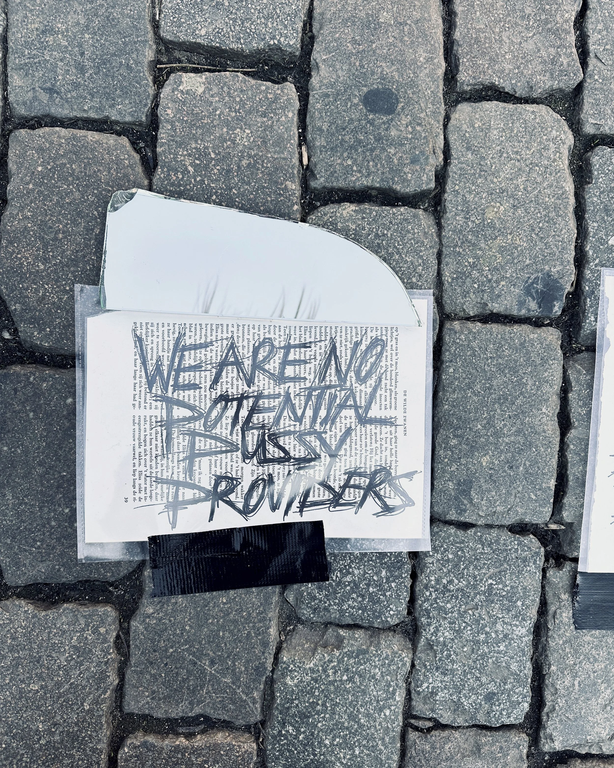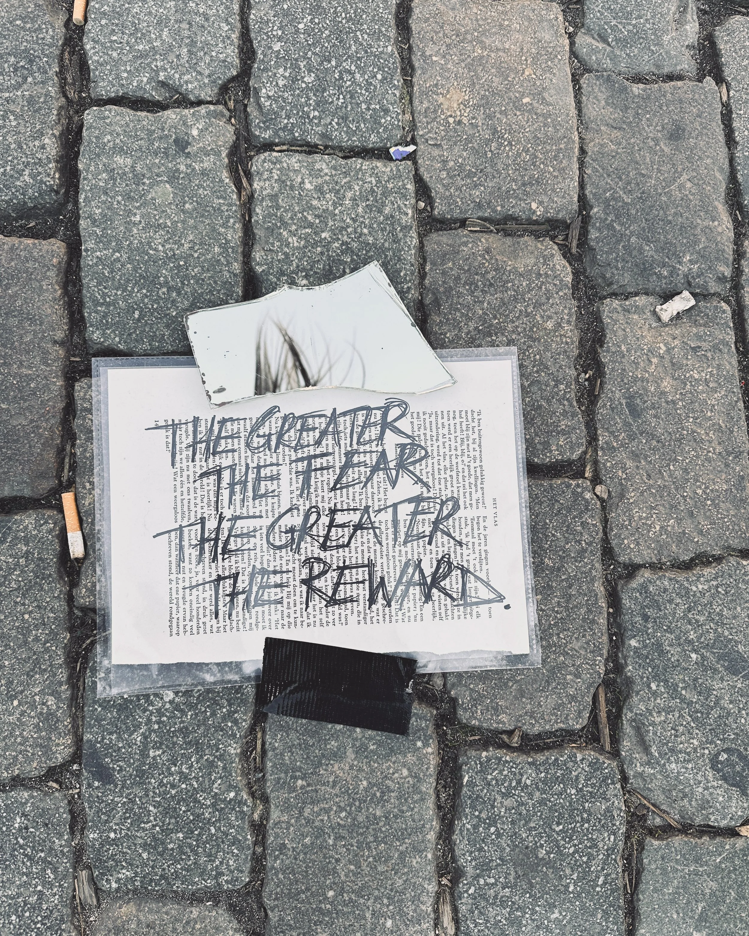 In total twenty-one feministic - targeting Andrew Tate, yet forgiving - statements were placed on the floor in the center of the square, positioned as a battle line, symbolising the ancient Greek Amazons. Each textual statement was accompanied by a mirror shard, sharp as a contemporary weapon. Both the texts and the shards were left behind, not knowing if, and by whom, the works were eventually taken and cherished, or destroyed and discarded.