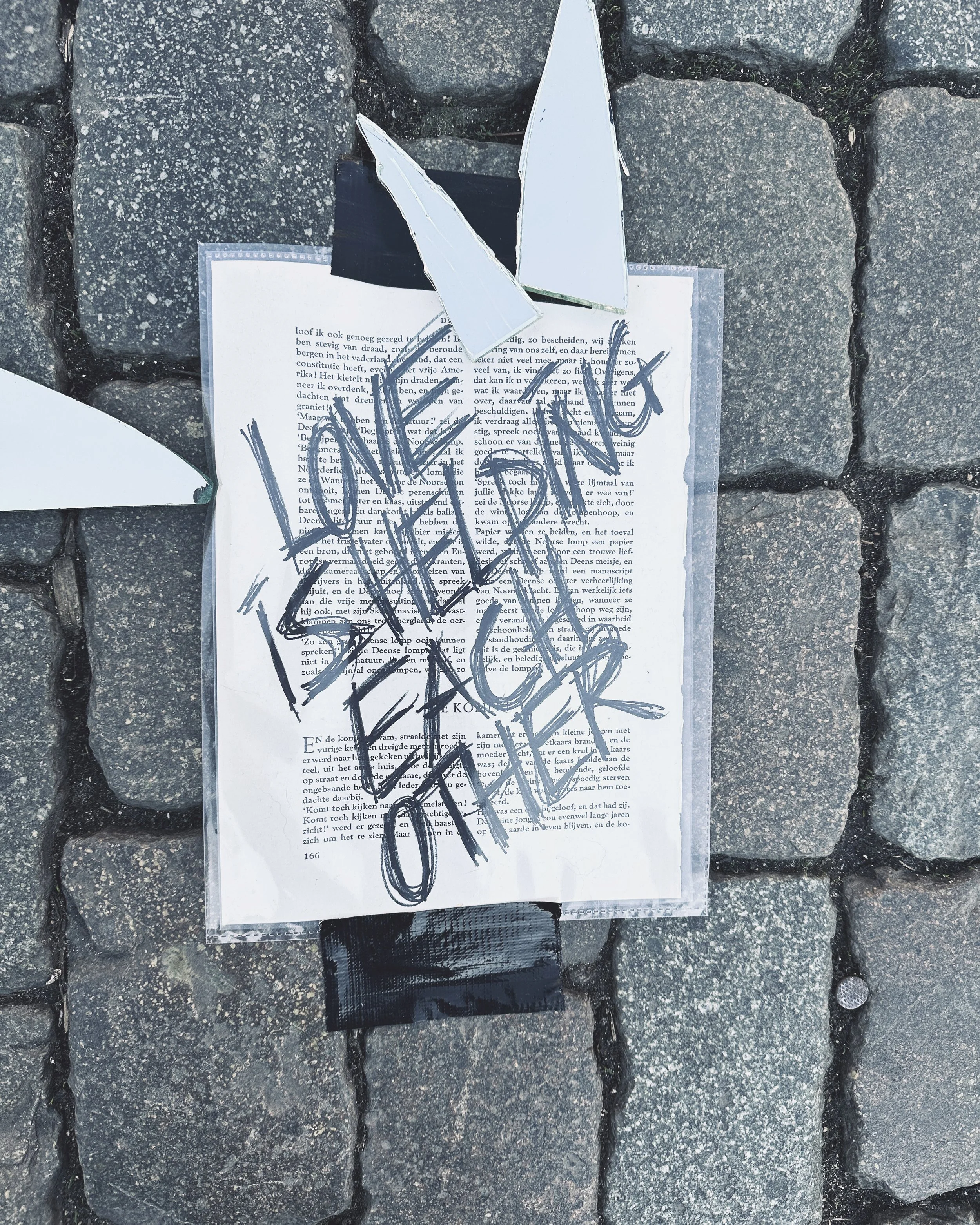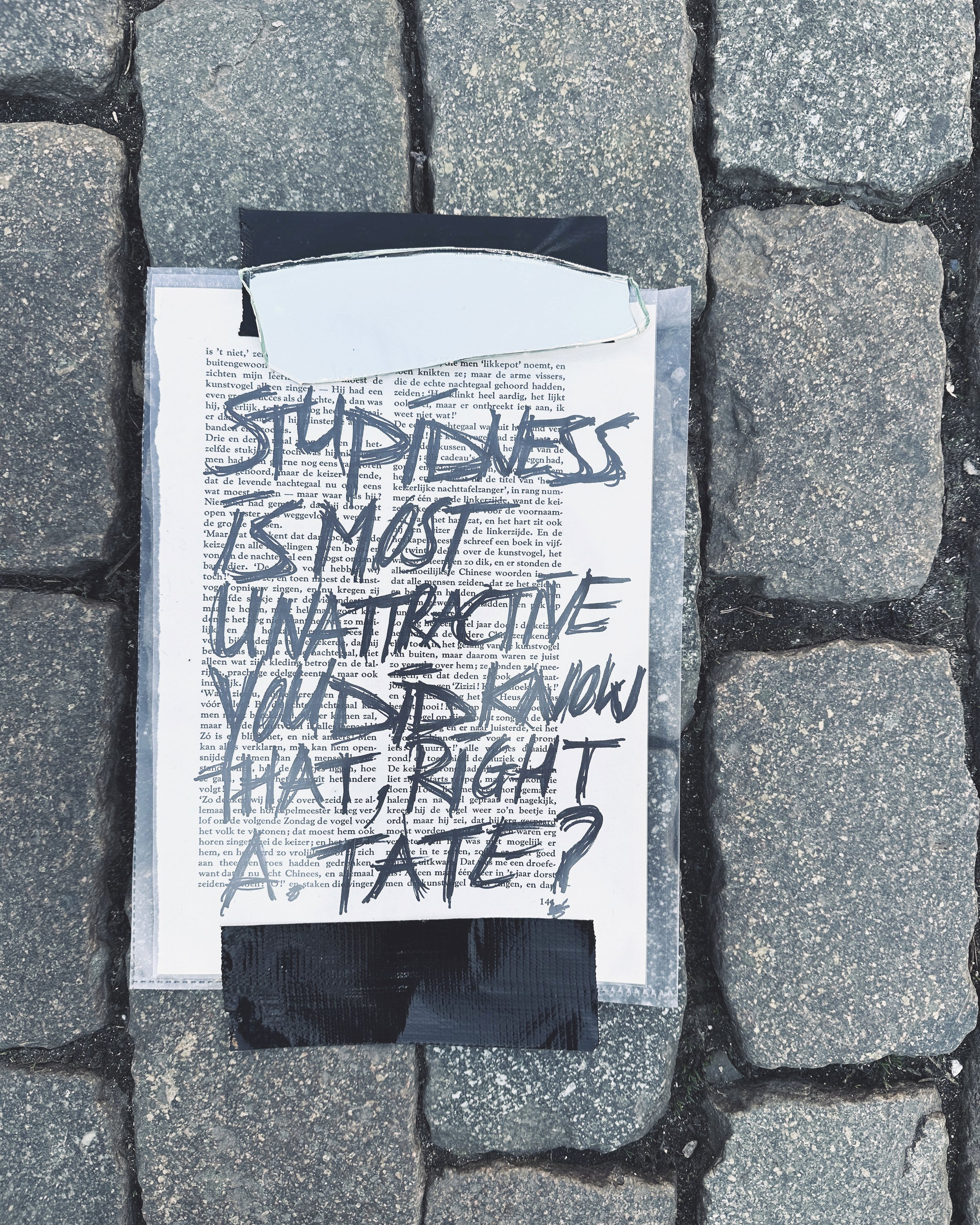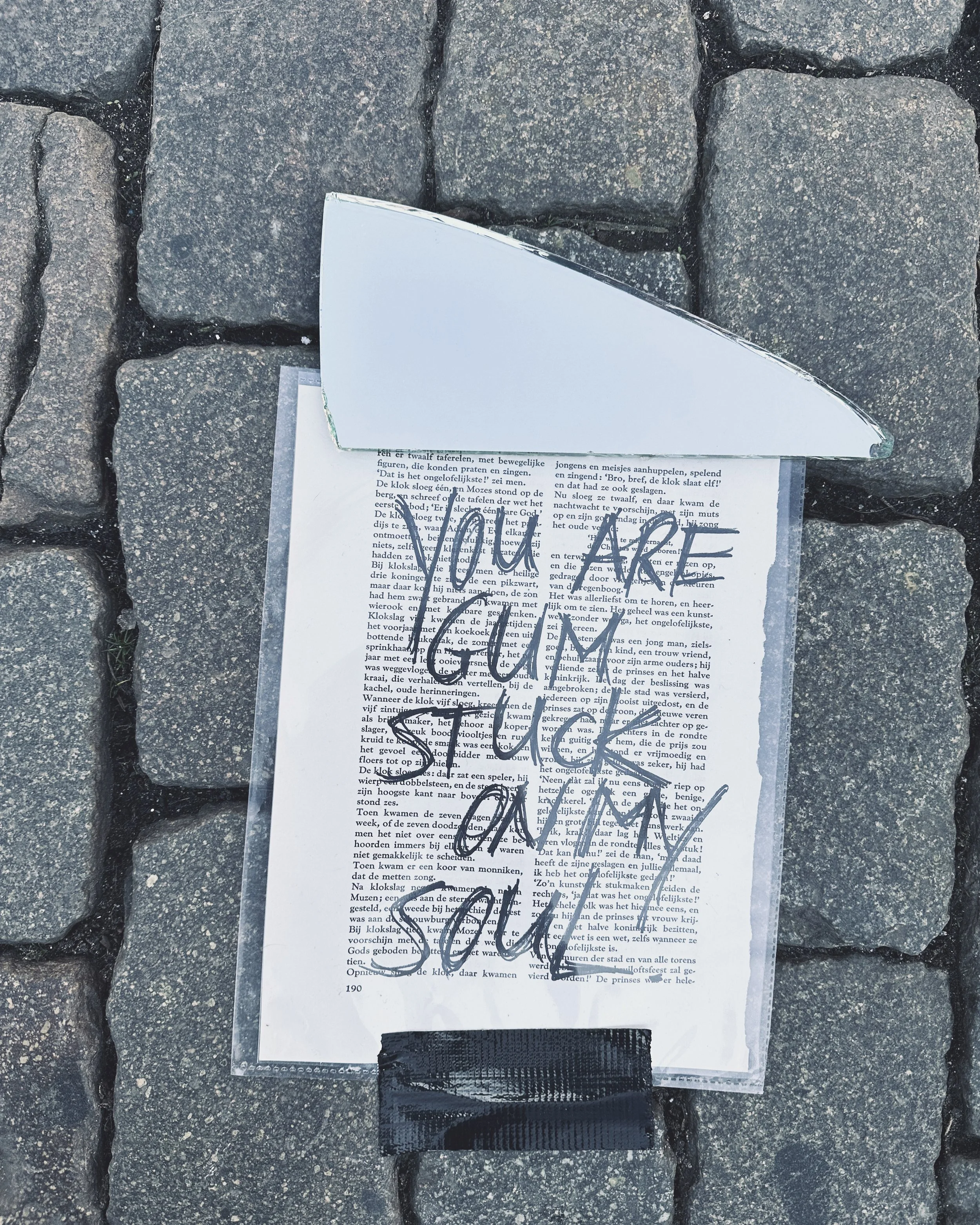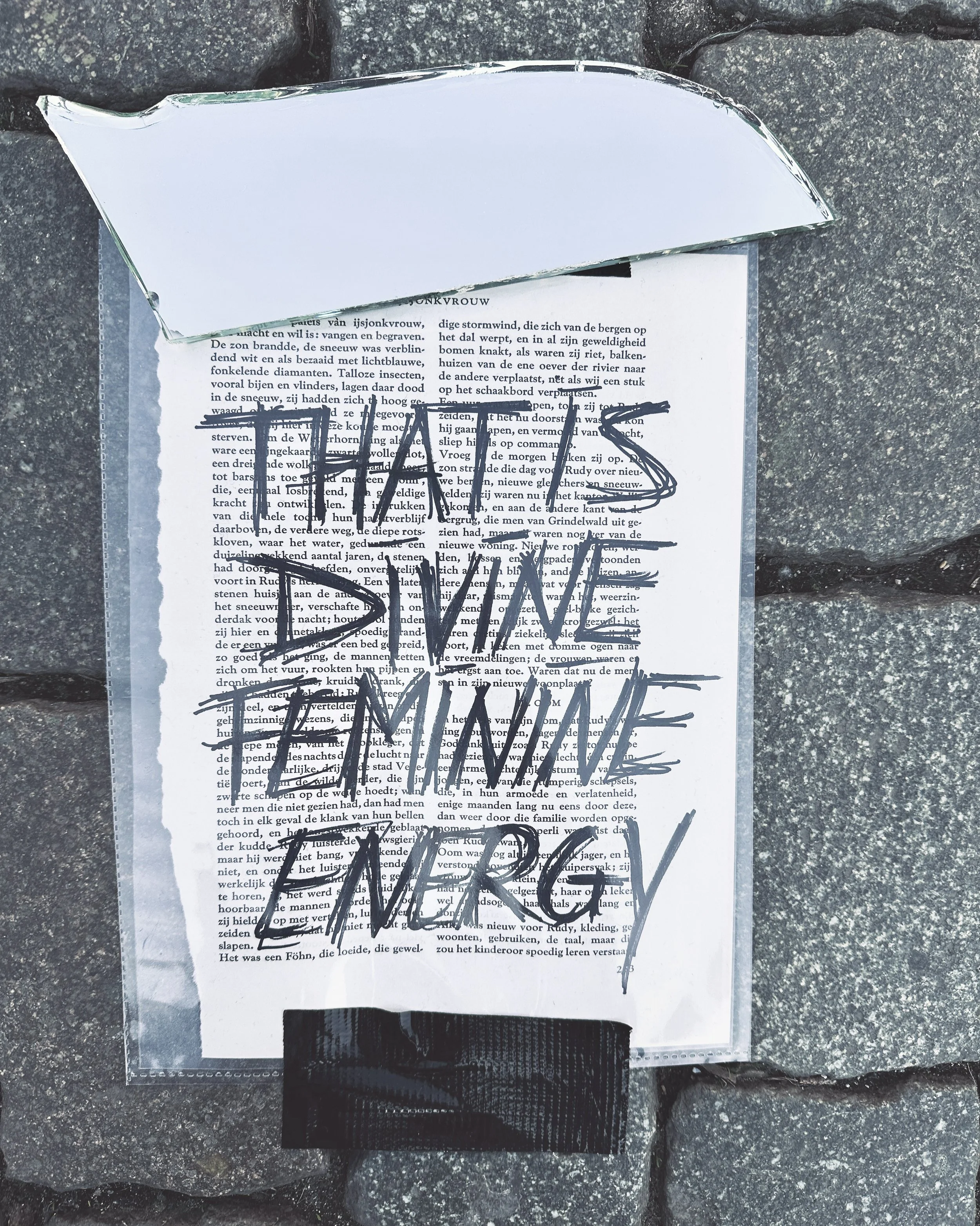In total twenty-one feministic - targeting Andrew Tate, yet forgiving - statements were placed on the floor in the center of the square, positioned as a battle line, symbolising the ancient Greek Amazons. Each textual statement was accompanied by a mirror shard, sharp as a contemporary weapon. Both the texts and the shards were left behind, not knowing if, and by whom, the works were eventually taken and cherished, or destroyed and discarded.