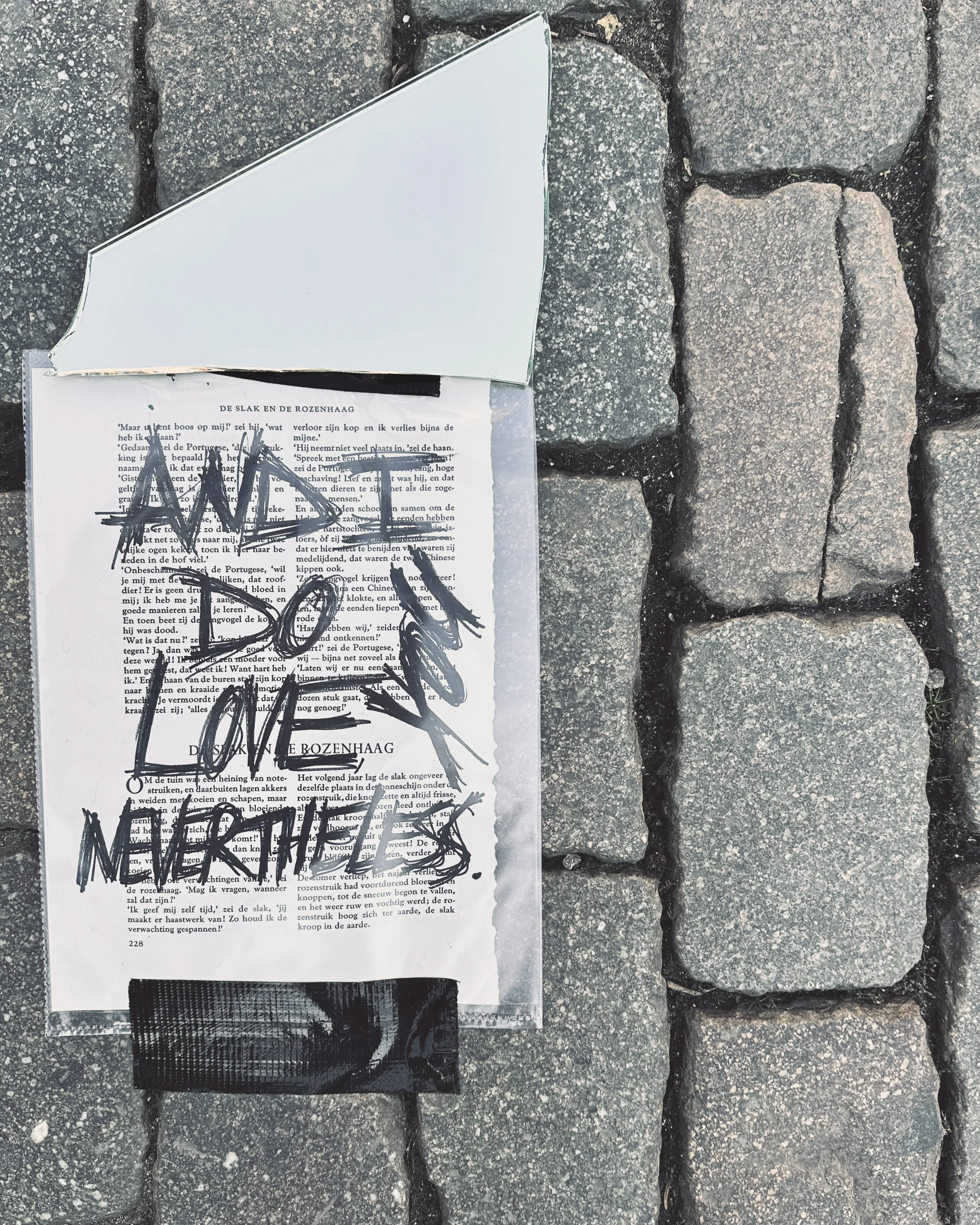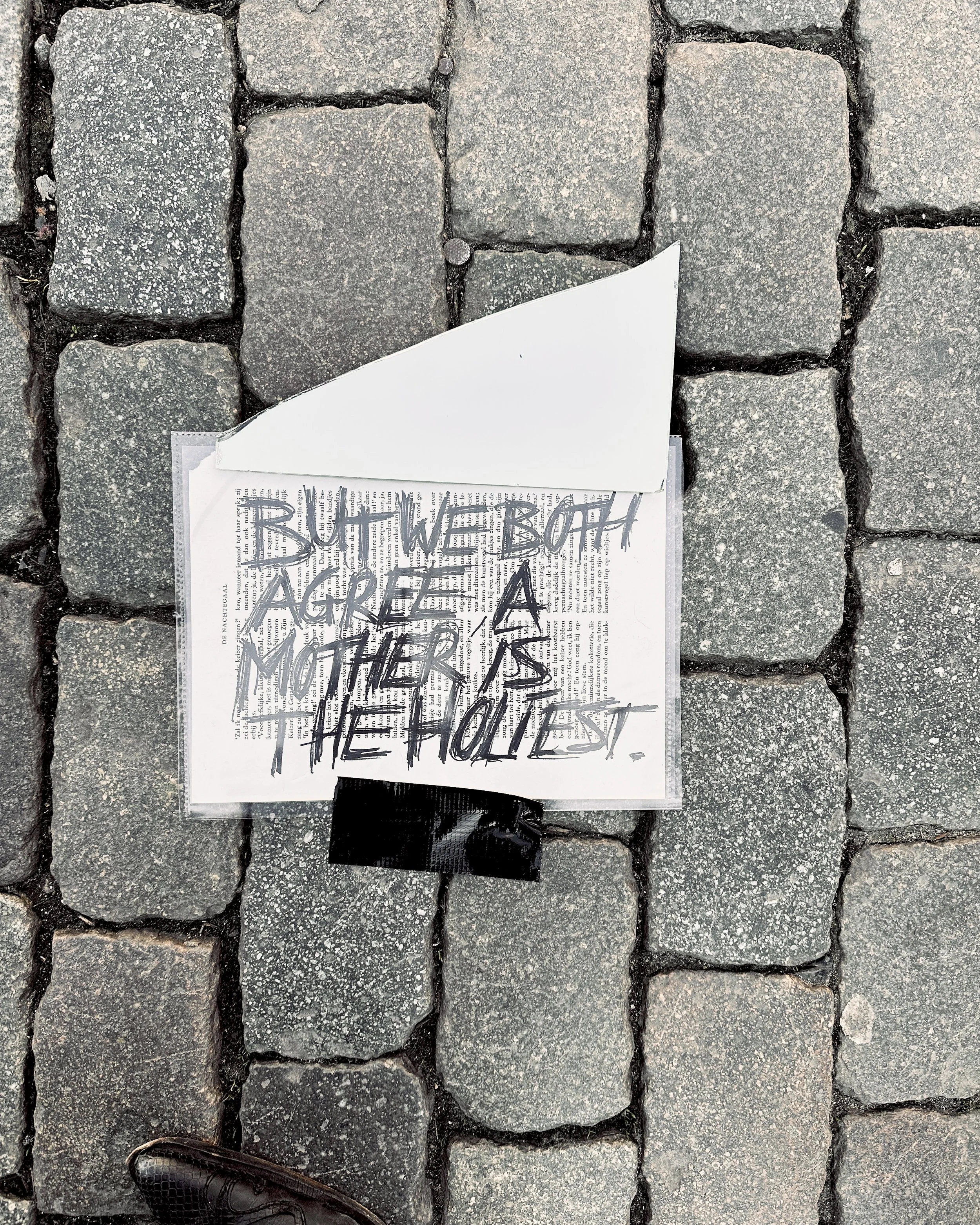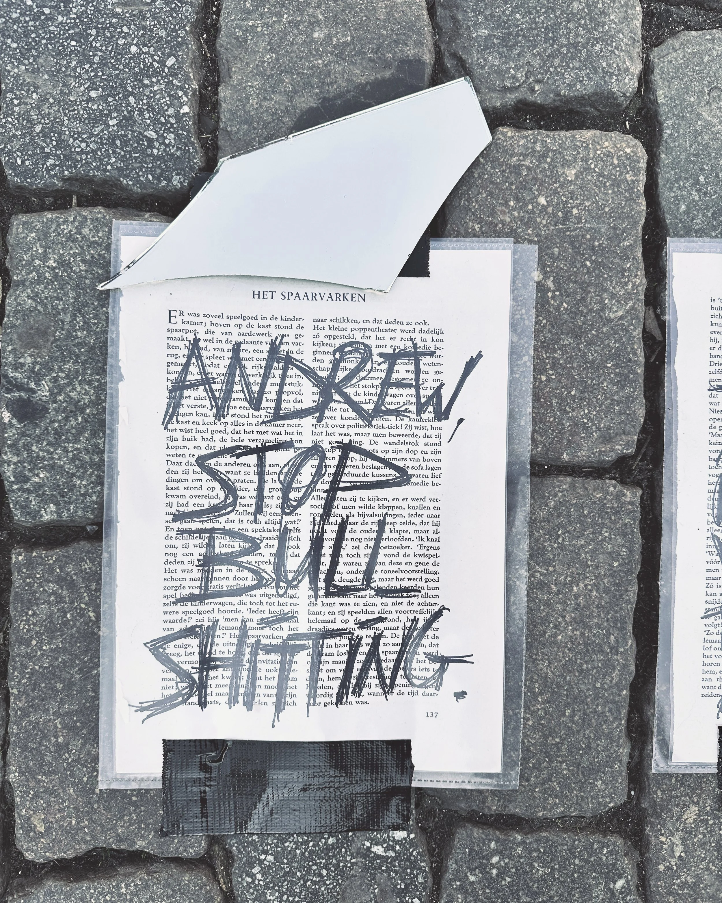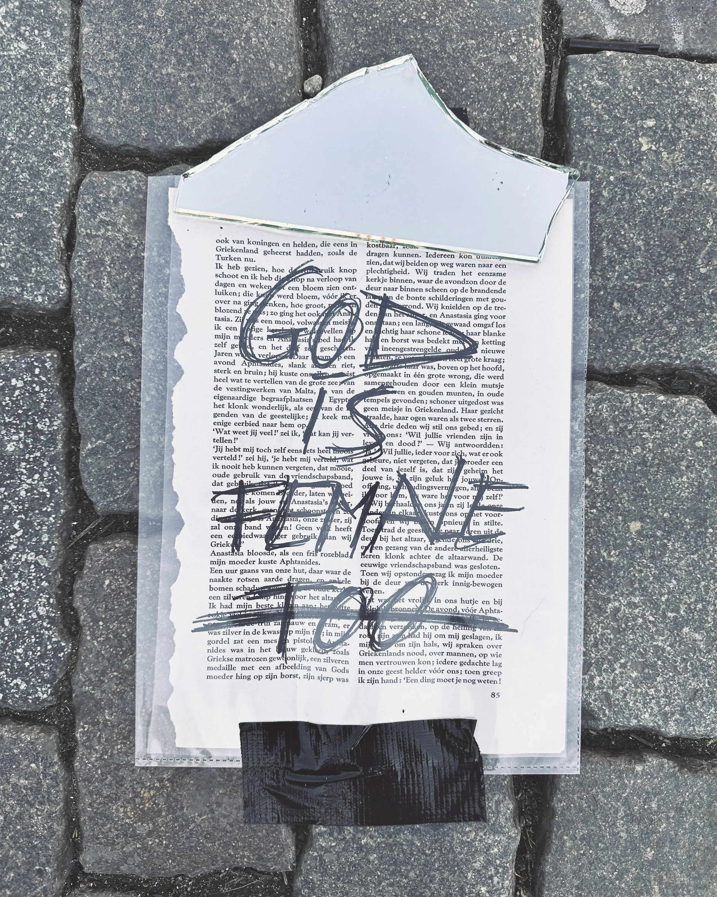 In total twenty-one feministic - targeting Andrew Tate, yet forgiving - statements were placed on the floor in the center of the square, positioned as a battle line, symbolising the ancient Greek Amazons. Each textual statement was accompanied by a mirror shard, sharp as a contemporary weapon. Both the texts and the shards were left behind, not knowing if, and by whom, the works were eventually taken and cherished, or destroyed and discarded.