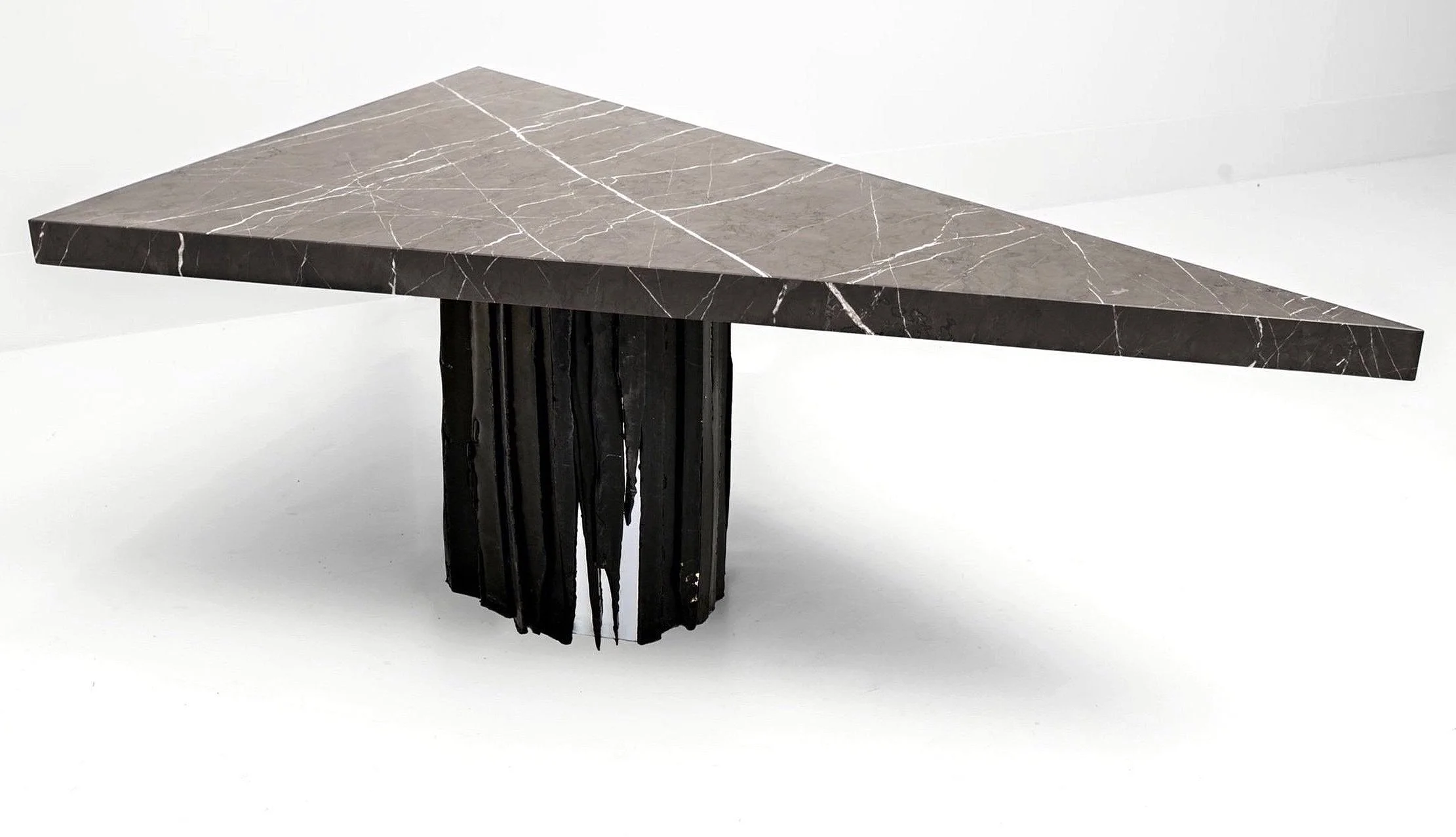 Black marble triangular table with melted recycled plastic base, waste mirror shards and a steel construction. Height 74 cm x width 230 cm x depth 120 cm.