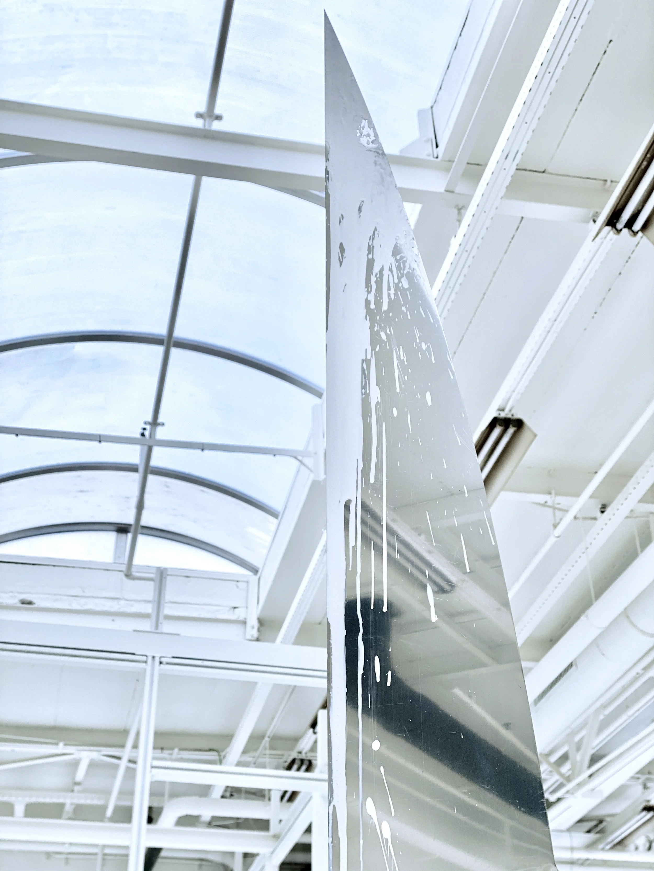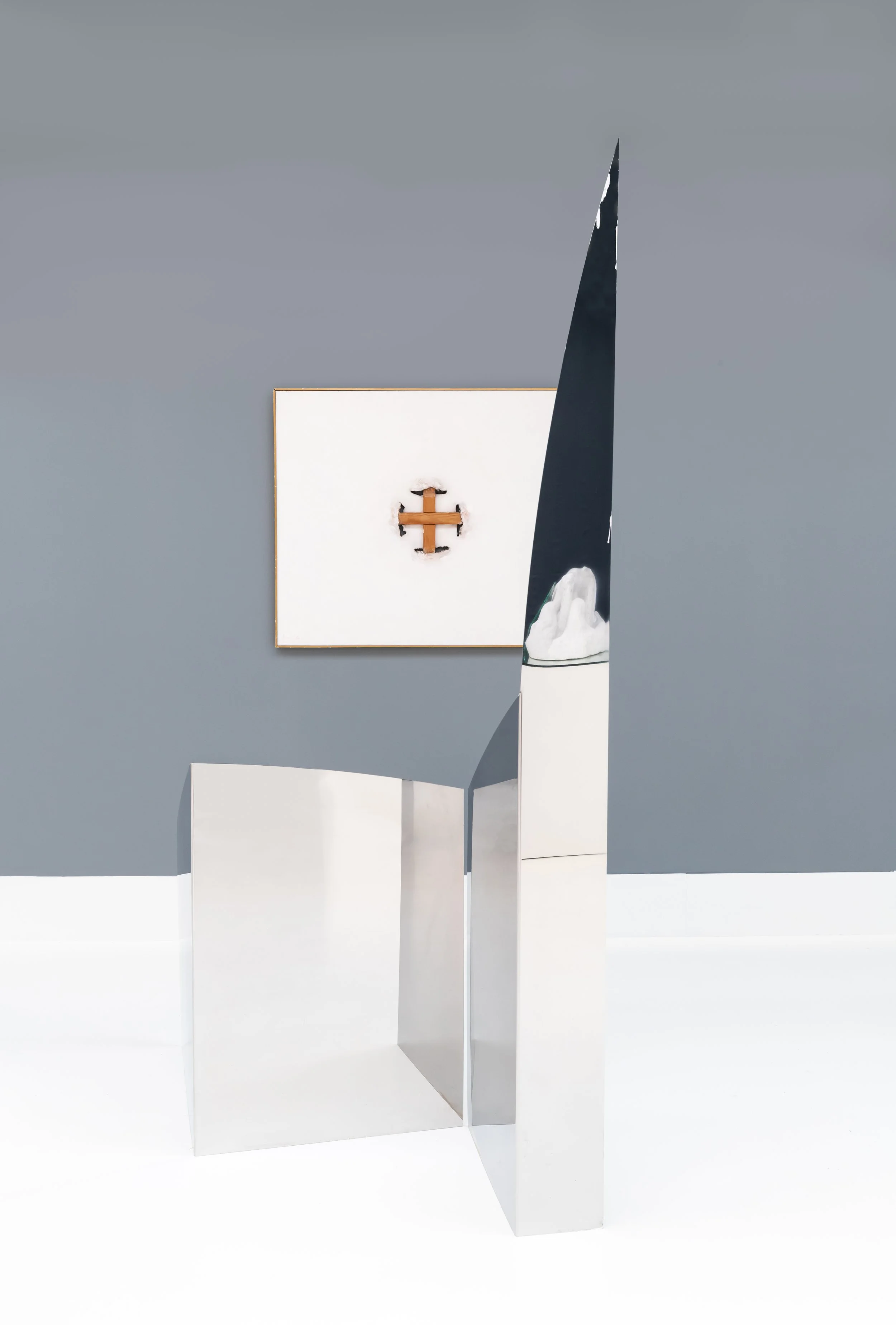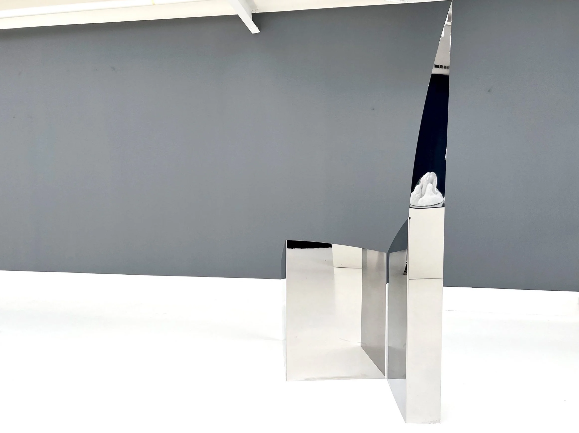 I LONG FOR SOMETHING SACRED - An abstract, self-reflective art piece about transcendence and purpose. It is a freestanding, mirrored stainless steel object with a white acrylic paint splash at the back. The sculpture consists of two separate parts placed side by side. One could say it is shaped like an abstract church, representing a new kind of modern piety.