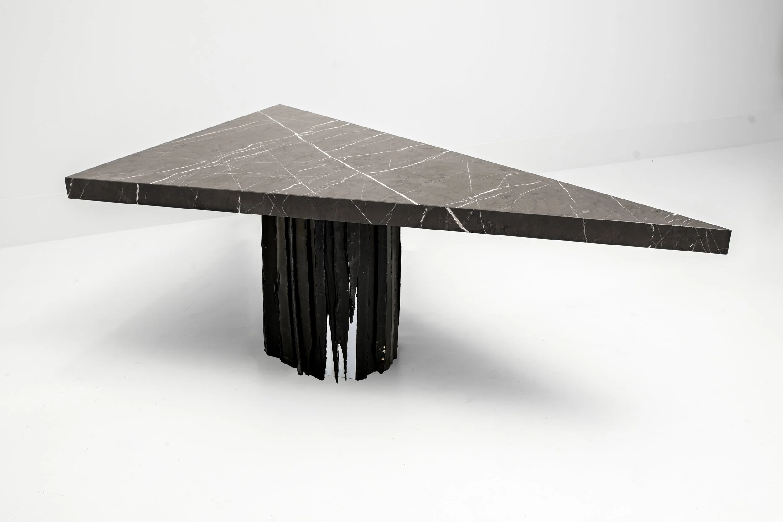 The table emits a fierce energy that cuts miraculously primitive-sophisticated through its surrounding space, like a threatening repelling yet appealing knife, harmless but with a perceptible menacing presence.