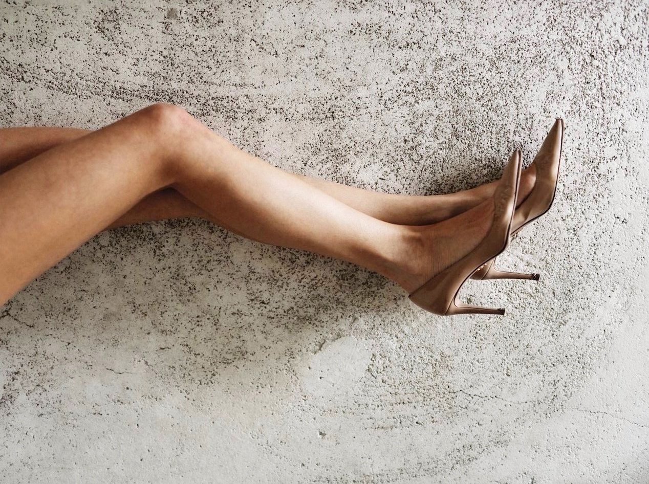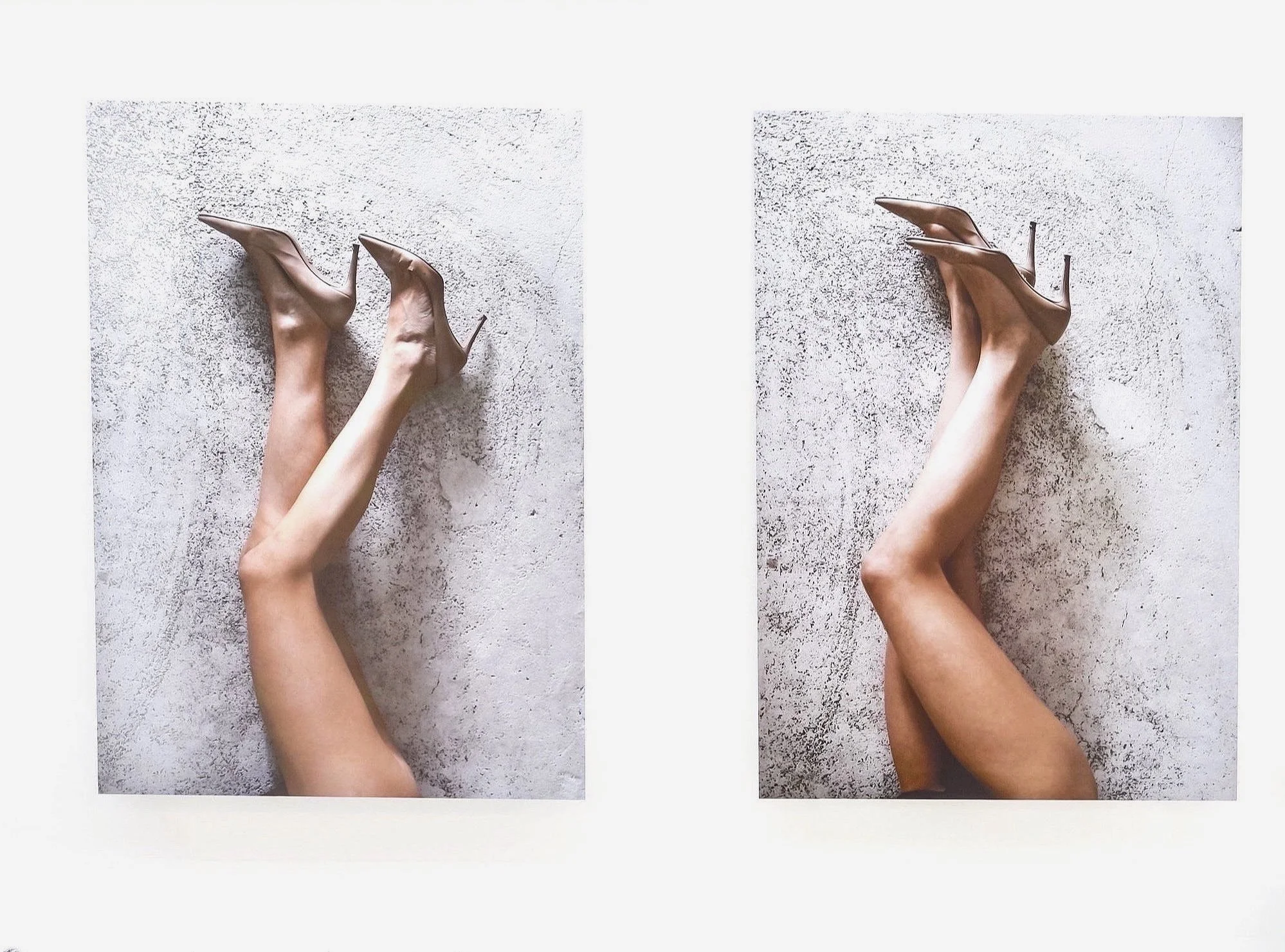 YOU TURN ME (ON) consists of two different photos of unretouched woman's legs, both with nude heels that show wear and tear, situated on a raw white concrete background.