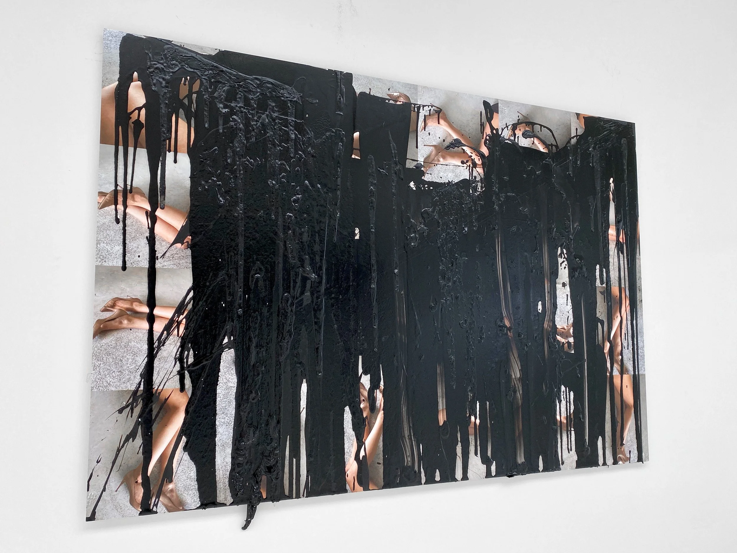The black paint is intentionally viscous and raw in structure as an additional contrast to the light-hearted and playful photographs of the sensual female legs in the background.